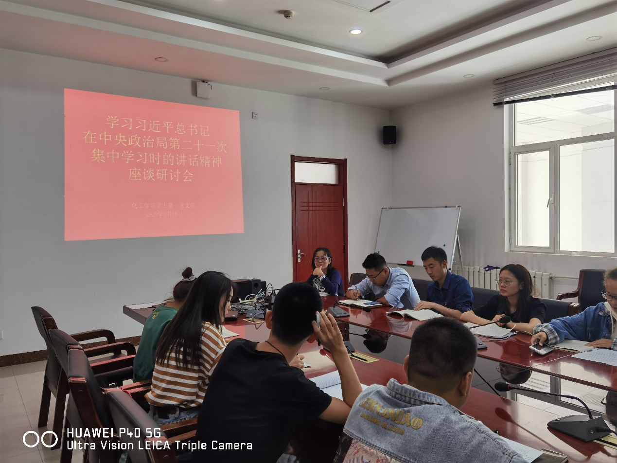 2020年9月17日中午12:45,乐天堂 学生第一党支部在逸夫楼E202召开“学习习近平总书记在十九届中央政治局第二十一次集体学习时的讲话精神”座谈研讨会。会议由党支部书记王涛老师主持,观察员能源与环境工程FUN88 党总支副书记孙岩柏老师参加了会议。
