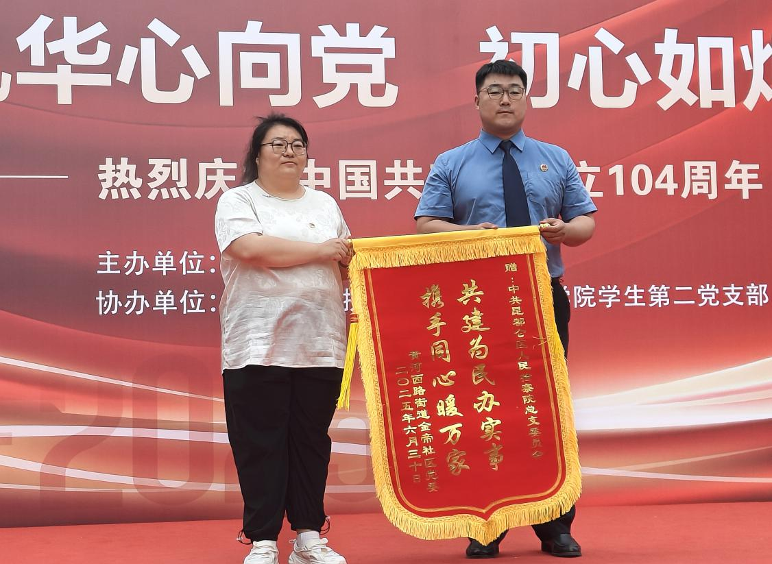 活动现场亮点纷呈,三大特色环节生动展现了新时代党建工作的创新活力。在庄重热烈的氛围中,“青春合伙人计划——社区场景综合能力提升基地”正式揭牌启动,标志着校社双方迈入“党建+实践”双轮驱动的协同发展新阶段。一面印有“共建为民办实事携手同心暖万家”的锦旗在阳光下格外醒目,这是对昆区人民检察院在基层法治建设、民生服务等领域卓越贡献的崇高礼赞。活动现场还特别表彰了一批优秀单元长和楼栋长,通过颁发荣誉证书,树立基层治理标杆,激发全体党员对标先进、砥砺奋进的干事热情。最后,《中国,七月的阳光》的深情朗诵与《我爱你中国》的激昂歌声交相辉映,将现场爱党爱国的赤诚情怀推向高潮,为活动画上圆满句号。