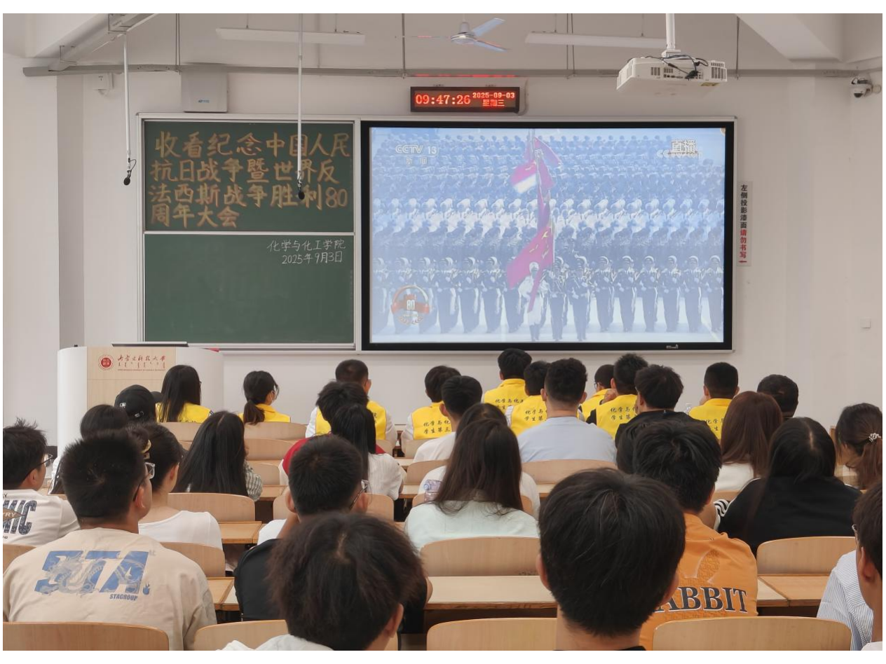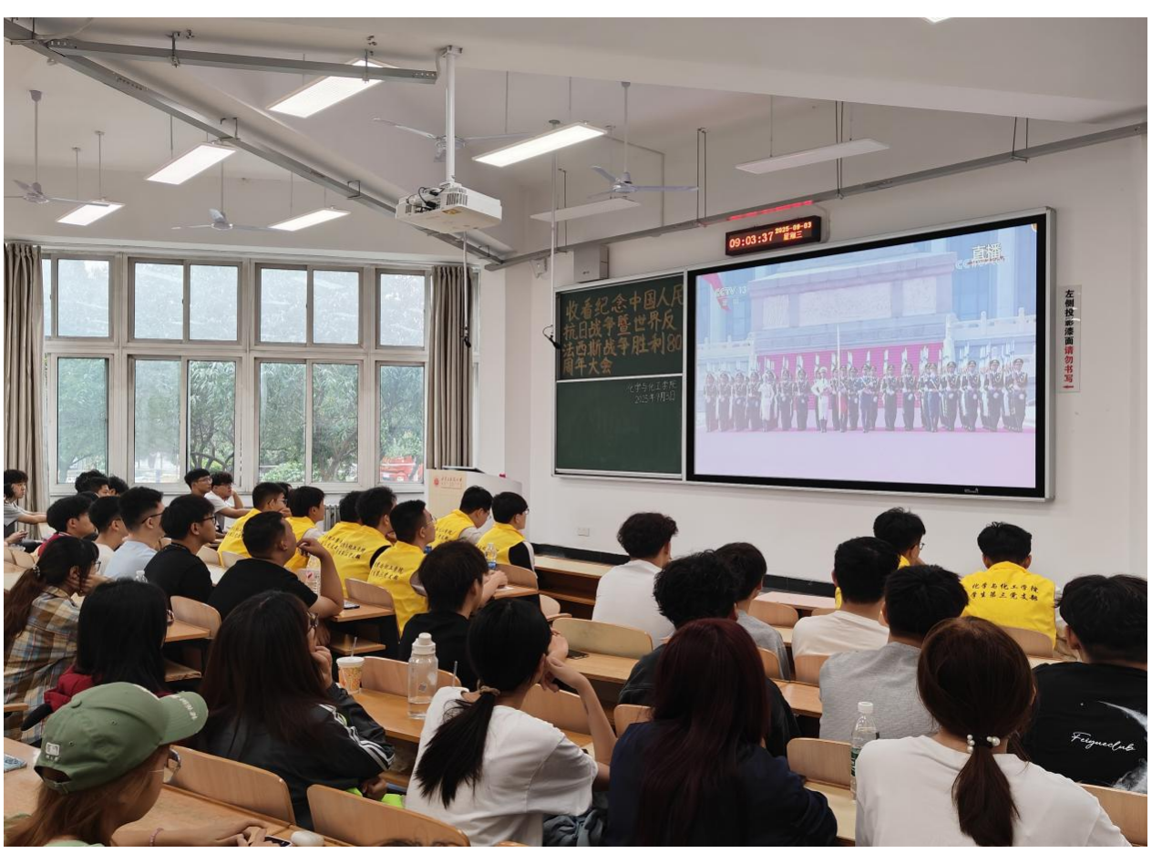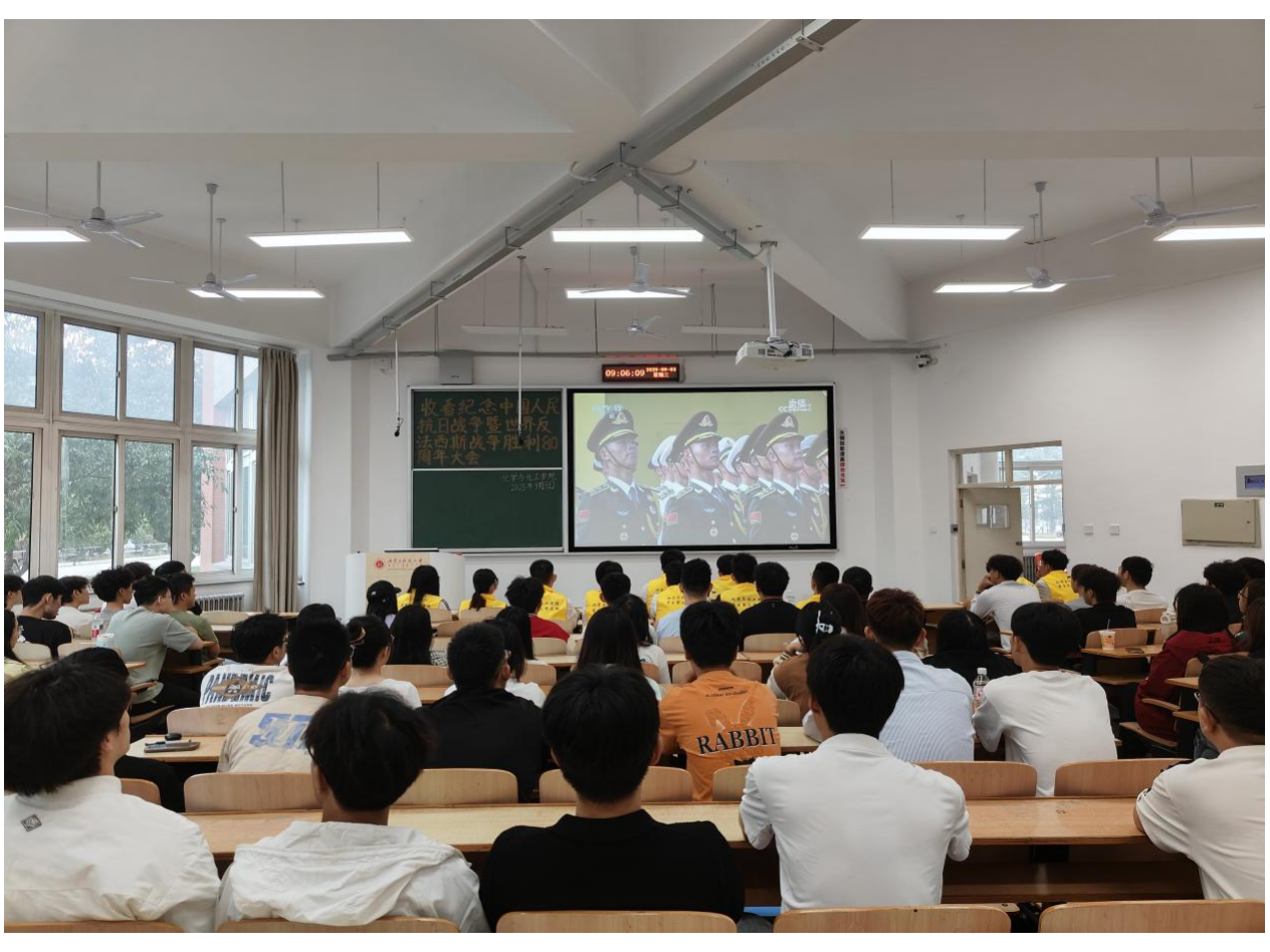 学生第三党支部全体党员及入党积极分子于二教A103进行“收看纪念中国人民抗日战争暨世界反法西斯战争胜利80周年大会”。