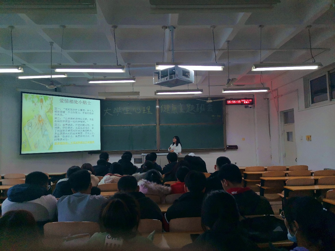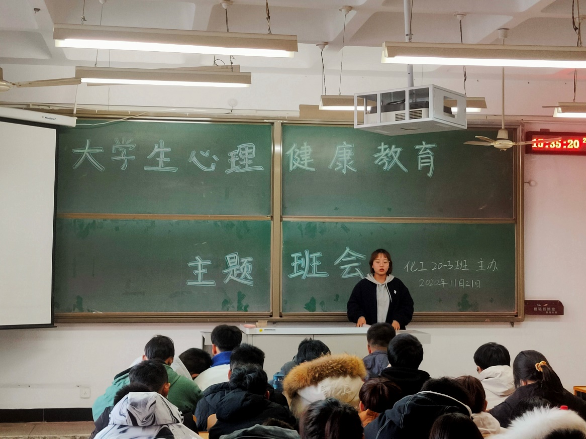 各班级主题班会由心理委员主持。班会围绕“如何管理自己的情绪”、“如何解决学习中的困惑,提高学习兴趣”、“学会与人相处,正确处理人际关系”、“如何规划我的大学生活”等内容展开。各班心理委员为同学们讲解心理健康知识,同学们积极配合、踊跃发言、进行游戏互动等,许多班级邀请到了本班副班主任在会上进行发言,最后由心理委员对本次班会进行总结。