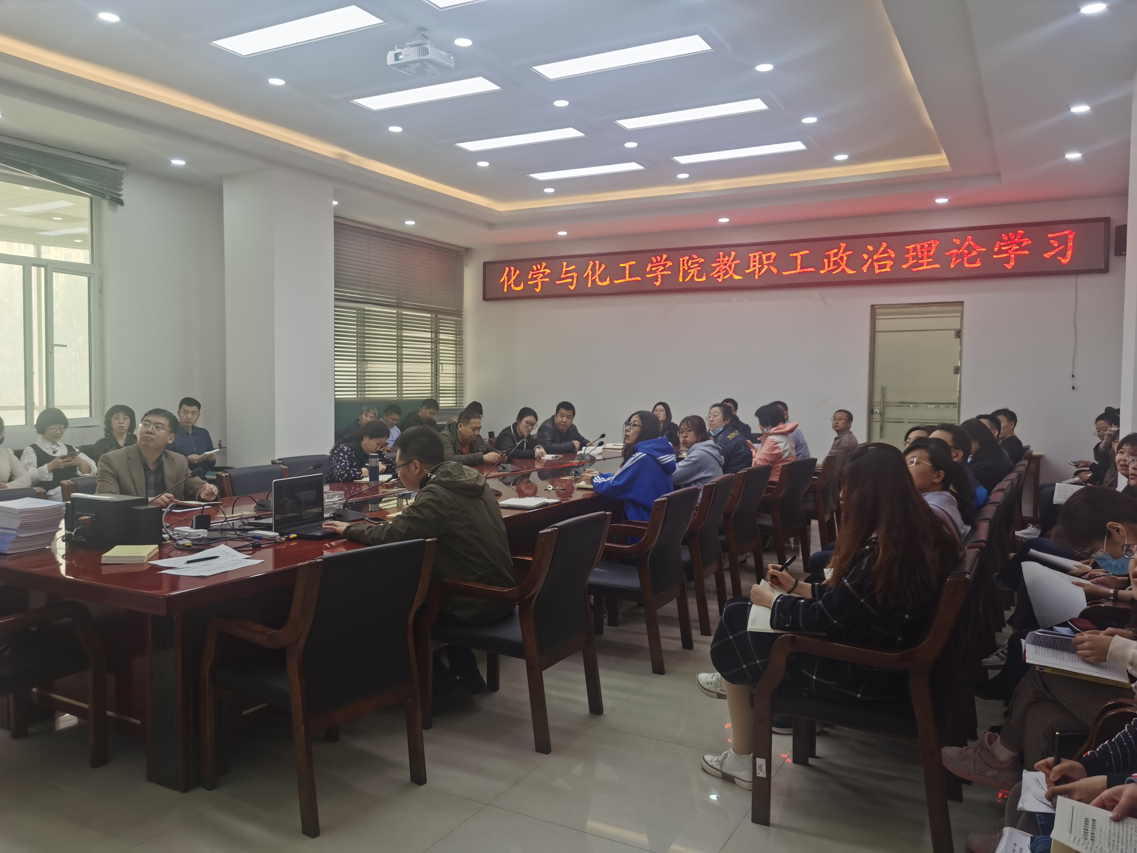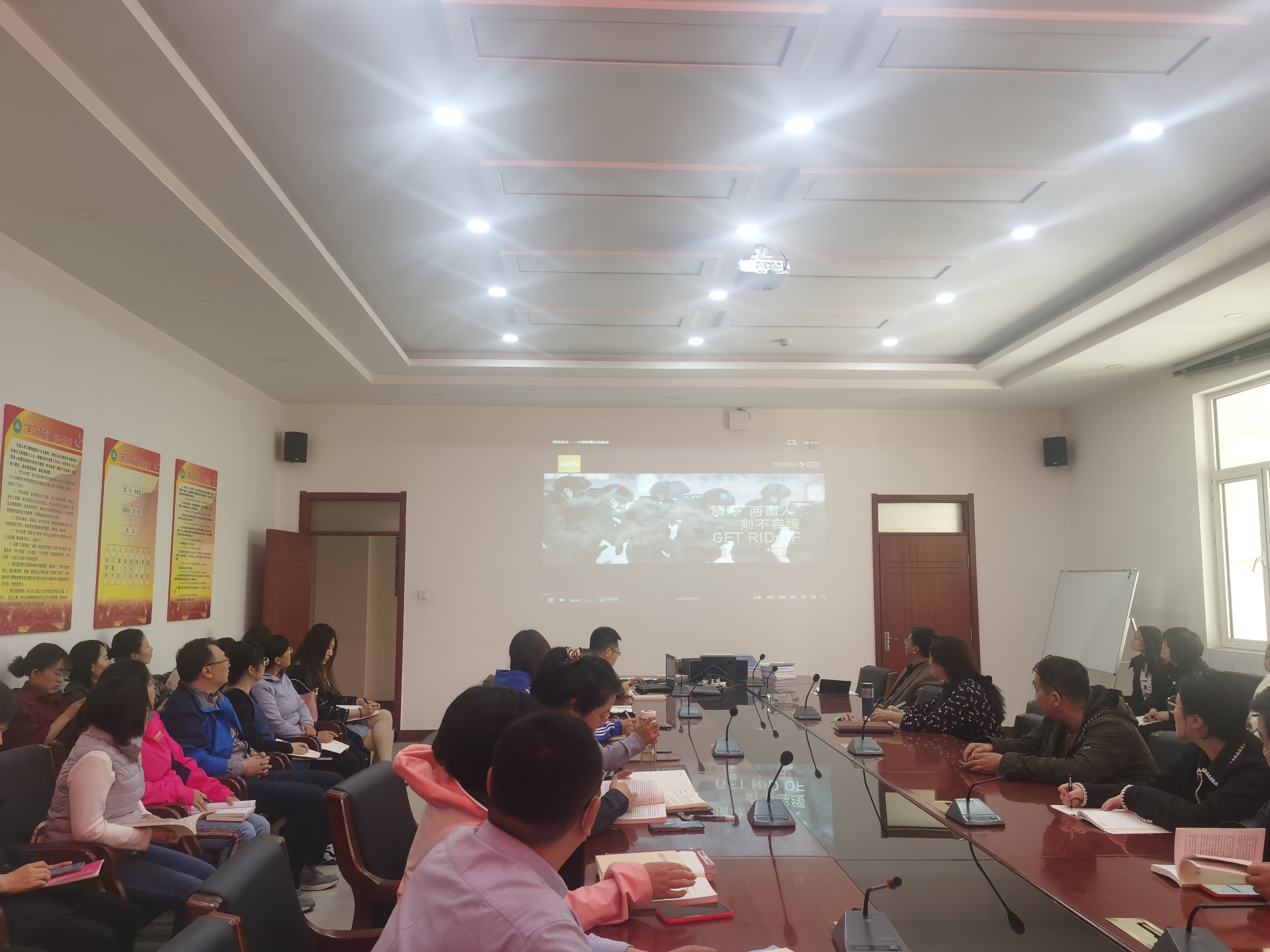 在逸夫楼E202会议室开展教职工政治理论学习。全体教职工参加学习。本次学习内容为:观看纪录片《暗流涌动-中国新疆反恐挑战》。