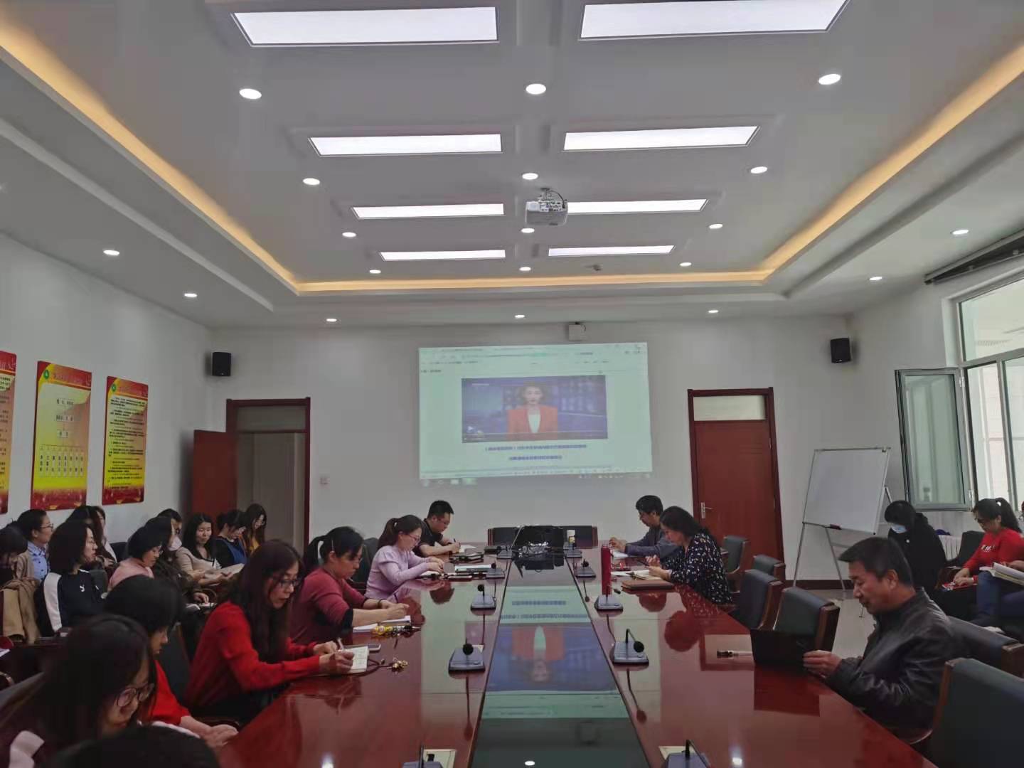 在逸夫楼E202会议室开展教职工政治理论学习。全体教职工参加学习。本次学习内容为:2021年全国两会精神学习。