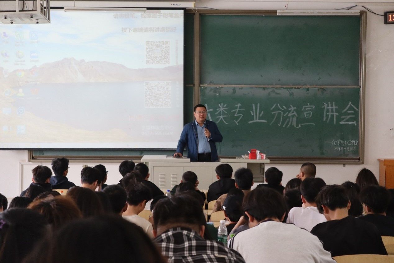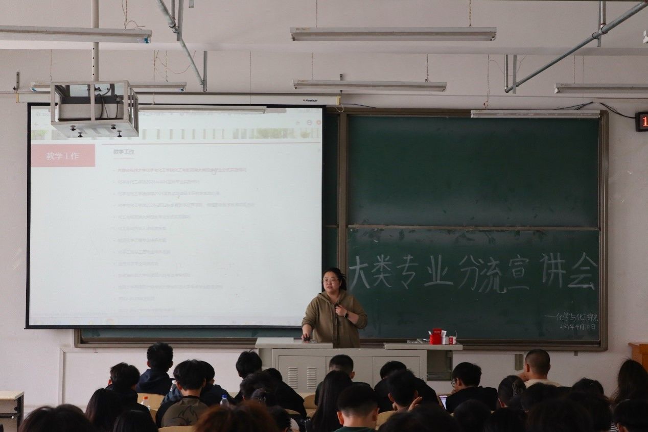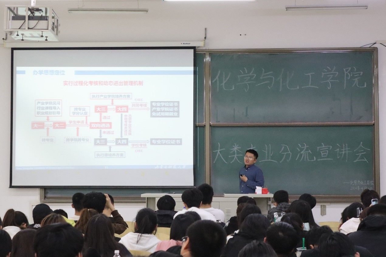 化工与制药类大类招生专业分流实施细则》和分流工作流程。专业负责人周晨亮、成建国围绕专业概况、专业特点、课程设置、师资力量、专业前景、考研情况和就业状况等方面进行了详细介绍。在提问环节,同学们就自身关注的专业分流问题与老师们进行互动,针对同学们的疑惑,老师们给予耐心解答,使同学们对分流的专业有了清楚的认识。