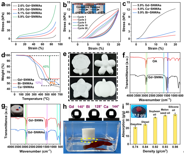 传统的金属氧化物气凝胶具有脆性和易碎的特点,而这里以金属氧化物NWs构筑的气凝胶则表现出良好的弹性行为。同时,不仅SNW在薄片中的聚集状态影响其构筑的气凝胶的力学性能,而且三种SNWAs的力学性能也表现出与它们的结构基元自身的刚性成正比的特性。由于SNWA具有良好的机械性能,因此可以创建各种复杂形状和尺寸的气凝胶。SNW上面存在的大量疏水基团,使得SNWA无需额外的疏水改性也具有良好的疏水性,并且对多种油都展现出良好吸附能力(图3)。