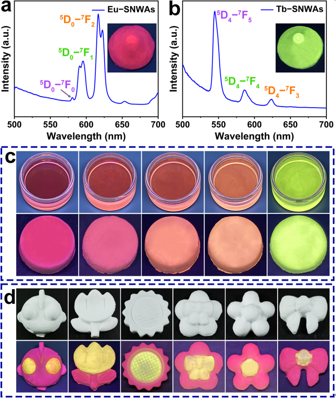 以含有稀土铕和铽的SNWs构筑的SNWAs展现出光致发光特性。在该研究的浓度范围内,这两种SNWAs的光致发光强度随着SNWs浓度的增加而增加,并未观察到明显的荧光猝灭现象。基于稀土的SNWAs,通过调整SNWs的混合比例,可以制备出可调谐的发光颜色的SNWA。这展现了SNWAs在信号和光电器件领域中具有巨大的应用潜力(图4)。