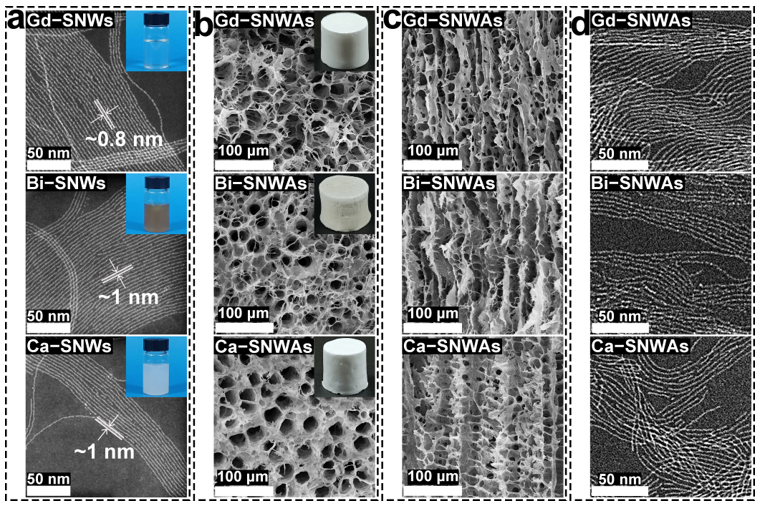亚纳米线(SNW)由于其极小的尺寸而具有许多令人着迷的性质,这些性质使它们近几年被科研工作者们广泛关注。然而,如何将SNWs构筑成能够保持其结构特征和物理化学性质的宏观功能材料(如气凝胶)是一个巨大挑战。这是因为目前已报道的SNWs的性质与传统超临界干燥或冷冻干燥制备气凝胶的技术并不兼容。