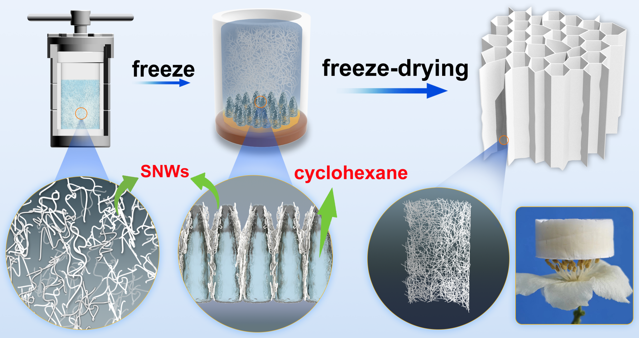 赛华征教授基于SNW的独特分散性,提出了一种采用高熔点非极性溶剂(即环己烷)为介质,经冷冻铸造来制备亚纳米线气凝胶(SNWA)的方案。所制备的SNWA不仅展现了SNW大量的物理和化学性质,而且在光致发光领域具有很大的应用潜力。
