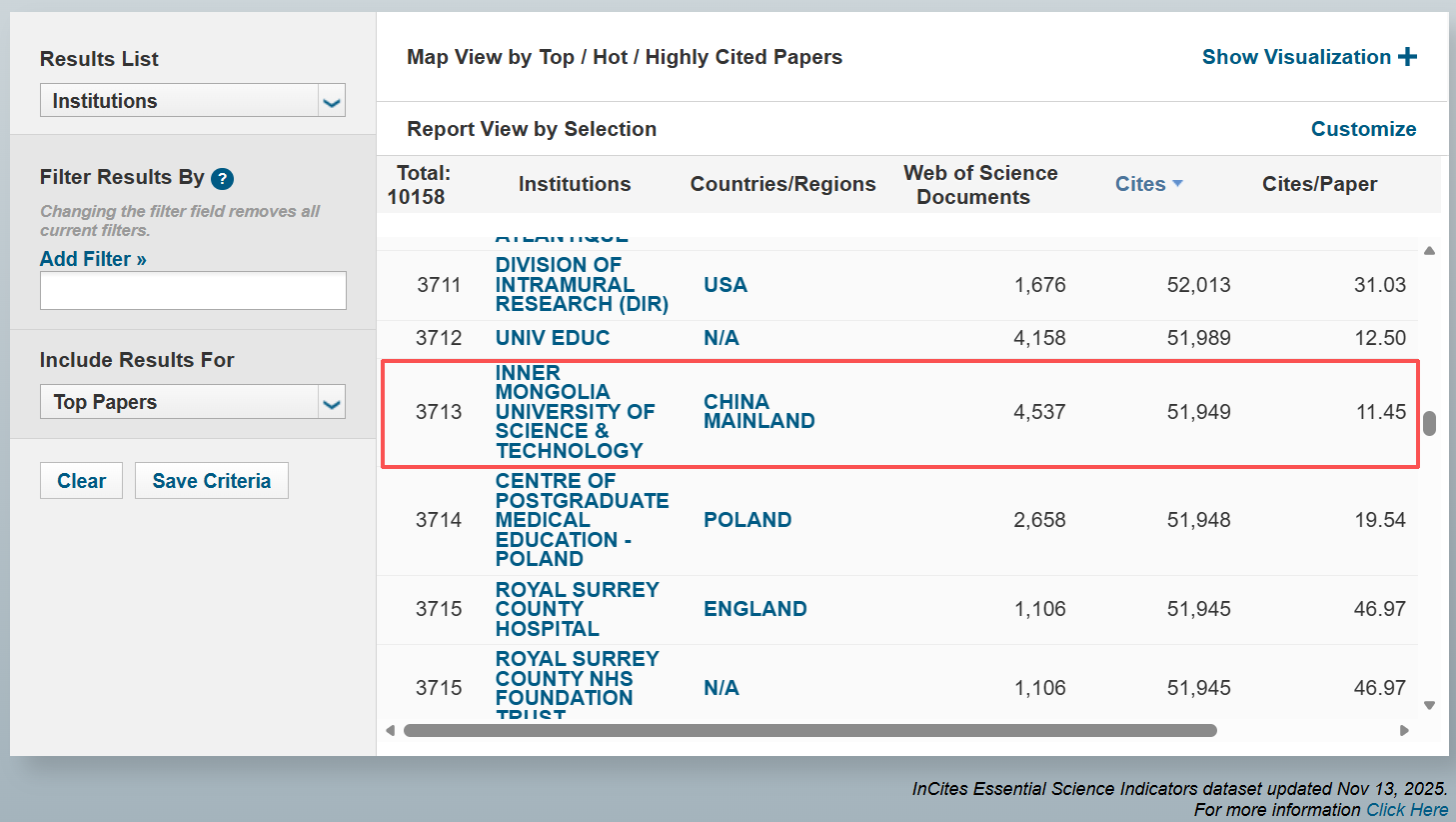 据科睿唯安(Clarivate)2025年11月发布的最新一期《基本科学指标数据库》(Essential Science Indicators,简称ESI)统计数据显示,内蒙古科技大学化学(Chemistry)学科首次进入ESI全球排名前1%,实现学科建设历史性突破,标志着我校化学学科进入国际高水平学科行列。内蒙古科技大学目前已进入ESI前1%的3个学科具体表现如下: