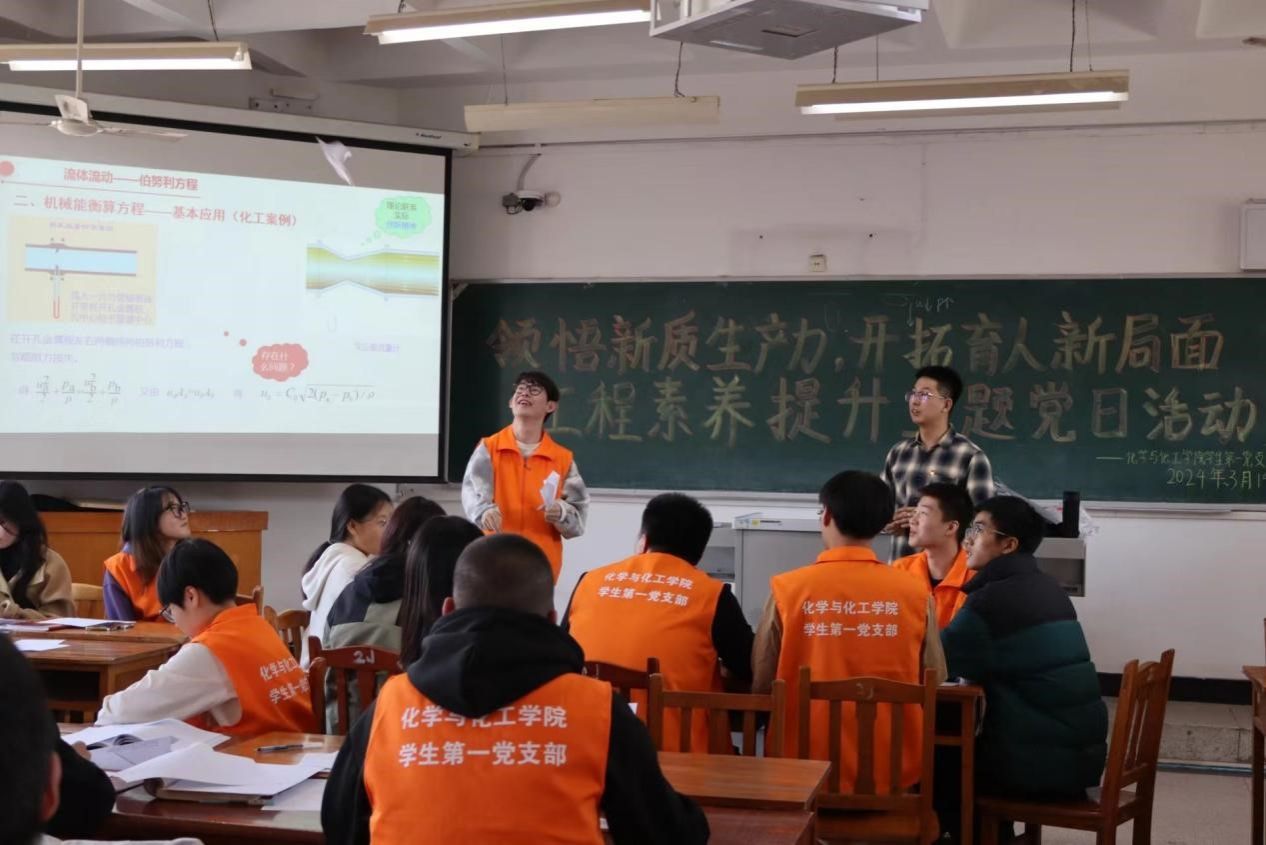 党支部副书记兰大为将理论教学和工程实践相结合,以生动的语言结合热点案例、工程案例讲述了专业知识,同学们互相学习、共同探讨、共同进步,激发学生的兴趣和潜能,形成良好的科学思维和工程思维,强化创新精神和创新意识,推动化工专业、行业发展,使学生树立绿色化工理念、具备工程素养和社会责任感。本次别开生面的课堂,立足教师育人使命、助力学生发展,聚焦课程育人、科研育人和实践育人,凸显党支部在育人成果建设过程中的政治引领作用和组织保障功能,融合创新,构建多元化课堂,培育发展新质生产力,发挥了赋能新质生产力的重要作用。