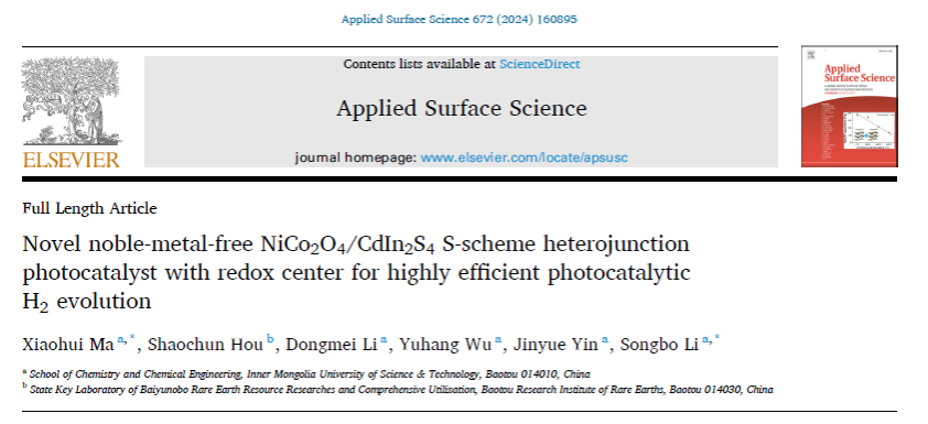 马晓辉博士在国际TOP期刊Applied Surface Science上发表题为“Novel noble-metal-free NiCo2O4/CdIn2S4S-scheme heterojunction photocatalyst with redox center for highly efficient photocatalytic H2evolution”(Appl. Surf. Sci. 672 (2024) 160895)的重要研究成果。马晓辉博士为该论文第一作者兼通讯作者,李松波教授为共同通讯作者,乐天堂