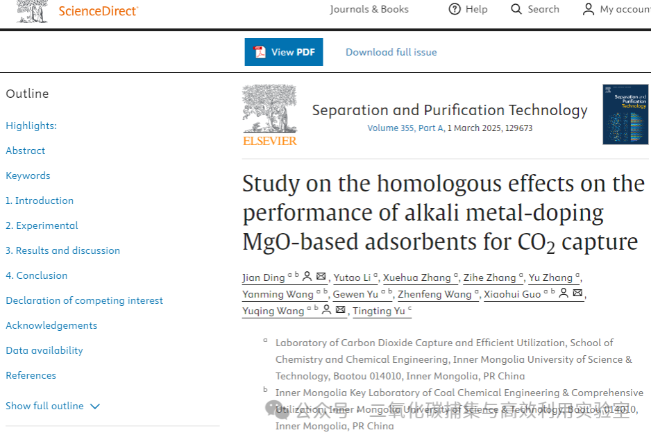 文章信息:Jian Ding*, Yutao Li, Xuehua Zhang, Zihe Zhang, Yu Zhang, Yanming Wang, Gewen Yu, Zhenfeng Wang, Xiaohui Guo*, Yuqing Wang*, Tingting Yu. Study on the homologous effects on the performance of alkali metal-doping MgO-based adsorbents for CO2capture. Separation and Purification Technology, 2025, 355, 129673. (SCI Top, IF= 8.1,1区)//doi.org/10.1016/j.seppur.2024.129673