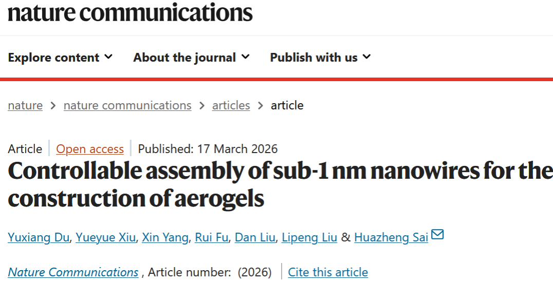 赛华征教授团队在稀土基亚纳米线气凝胶可控构筑领域取得新突破,相关成果“Controllable assembly of sub-1 nm nanowires for the construction of aerogels”发表于综合性国际顶级期刊《Nature Communications》(DOI: 10.1038/s41467-026-70713-8)。赛华征教授为论文的独立通讯作者,硕士研究生杜玉祥为论文第一作者,内蒙古科技大学为唯一完成单位。
