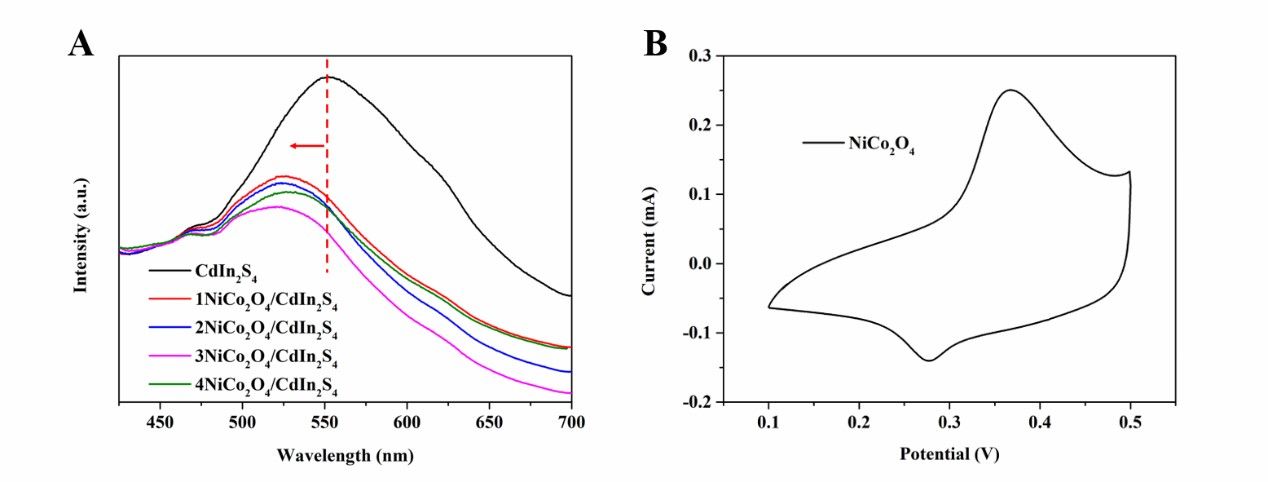 光催化水裂解产氢技术被认为是解决能源短缺和环境污染的最终途径。贵金属改性能极大的提高半导体的产氢活性,但其成本较高,开发经济高效的不含非贵金属的光催化剂十分必要的。基于此,马晓辉博士首次设计并制备了具有氧化还原中心的新型无贵金属NiCo2O4/CdIn2S4S型异质结光催化剂。